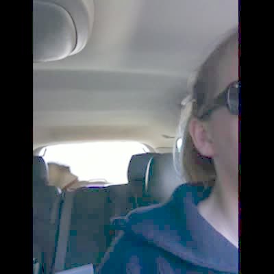 Puppy tries to climb over front seat of car, but falls backwards.