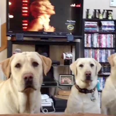 A yellow lab dog and a chocolate lab dog are asked a series of questions from a man and they nod their heads twice simultaneously to answer each one.