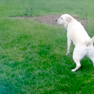 Lab dog grabs one of his hind legs with his teeth and walks across the yard with his own leg in his mouth.