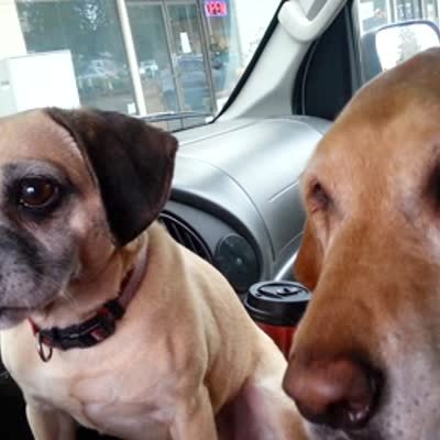 A woman holds out an ice cream cone to a small dog and a yellow lab dog in a car. The small dog licks the cone and then the lab dog bites the entire cone.