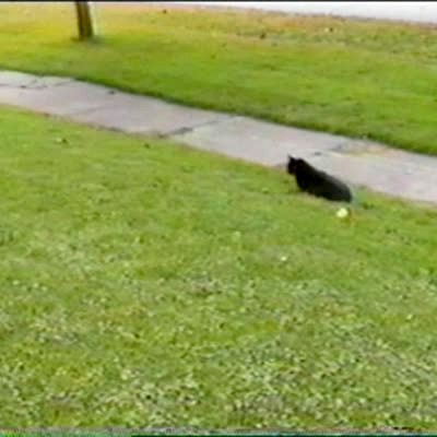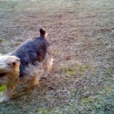 A ball is thrown on top of a dog cage. A yorkie dog sniffs at the ball, paws open the cage, goes inside, hits the ball off the top of the cage from inside, and chases after it. Pets.