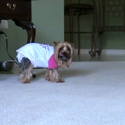 Yorkie dog wears a diaper & T-shirt and walks / hops awkwardly over to owner in the living room.
