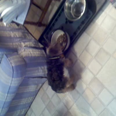 A Yorkshire terrier dog eats food from a bowl indoors and spins in a circle in between each bite.