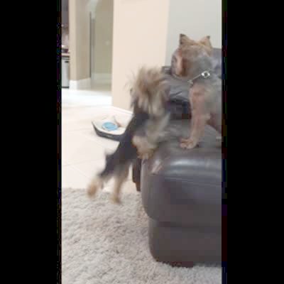 A Yorkshire Terrier dog barks and jumps repeatedly onto a couch but can't make it up indoors. Another Terrier sits calmly on the couch and just looks at the jumping dog.