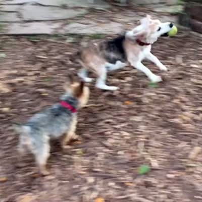 Two dogs play with a ball outdoors. The yorkie dog takes the ball while the beagle dog isn't looking. The beagle searches for the ball.