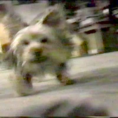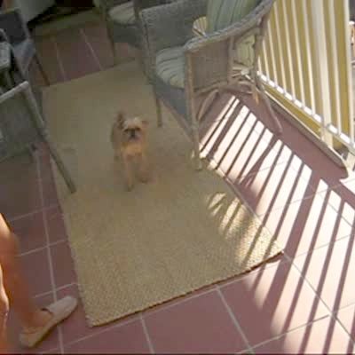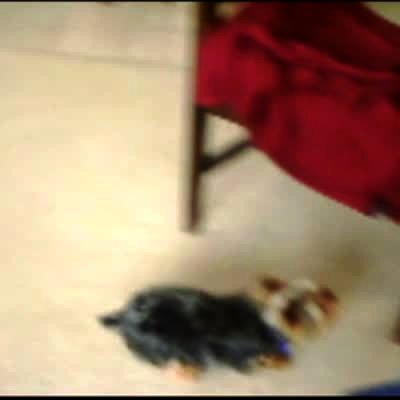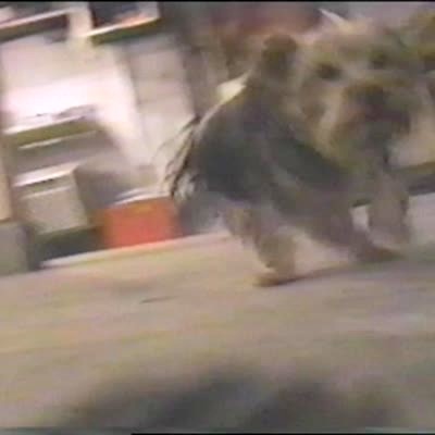 "Tiptoeing Terrier" A Yorkshire Terrier dog attempts to walk with shoes on and does a flip over itself indoors. Action at :17.