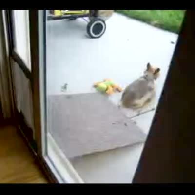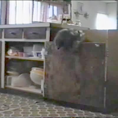 Small dog opens cabinet door, leans it against partition wall & uses it to help him jump over. Silly pet tricks, hidden camera.