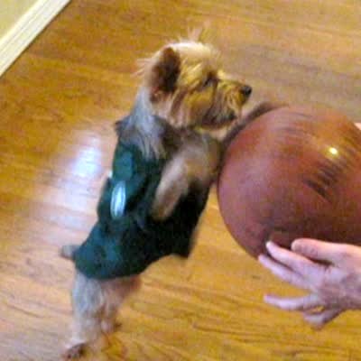 Yorkie dog in a t-shirt spins a basketball very quickly while man holds it.