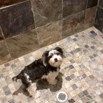 A Yorkie dog growls at a man in the bathroom to turn the shower on. The dog barks and spins around when he turns on the water in the bathroom.