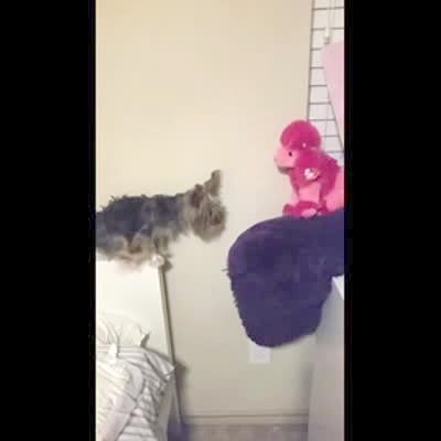 A Yorkshire terrier dog stands on a bed headboard indoors and stretches out to reach a stuffed animal on a nearby shelf before he falls down.