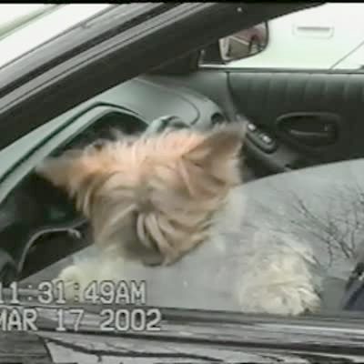 Angry little dog bites and chews on windows as it rolls up and down. Date on screen