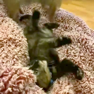 Yorkie dog dries herself on the rug after a bath by rolling around. Long for edit.