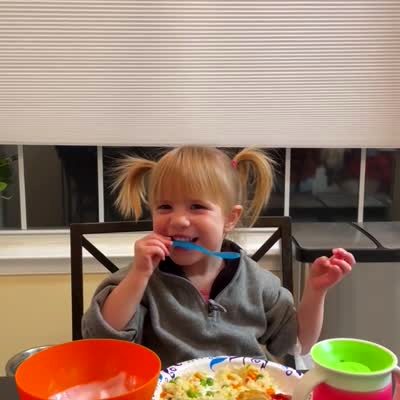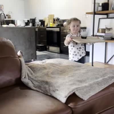 A young girl in the living room says she's thankful for her sister. The younger sister says she's thankful for "poached eggs."