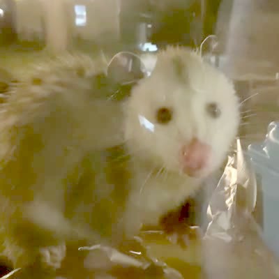 An opossum eats pumpkin pie on a deck while a mother and her daughters watch from inside the house. A young girl says "at least the pie didn't get wasted, Mom."