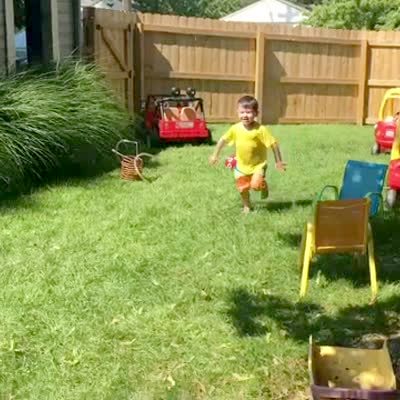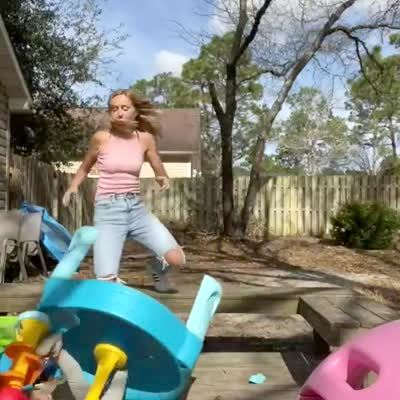 A woman and a young girl walk across an "obstacle course" of toys. The girl steps onto a toy, stumbling and falling backwards onto the patio.