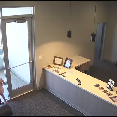 A young girl runs straight into the glass door as she's leaving an office. Security footage.