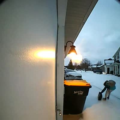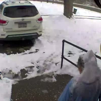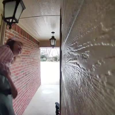 A young girl slams a door as she leaves the house, and a large amount of snow falls off the door and onto her head and shoulders. Security footage.