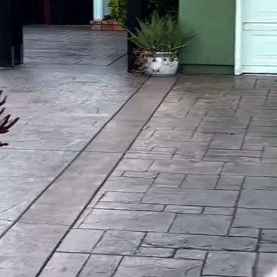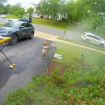As a woman walks up the driveway and gossips about a man, a young girl sprays her in the back with a hose. She yells at her to stop. Security Footage. Featured talent cleared (woman and child).