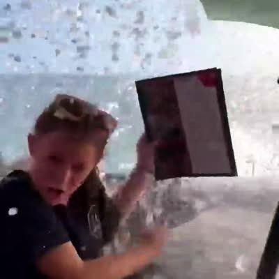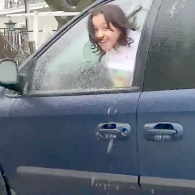 A young girl sits in the driver's seat of a car. The window is rolled down, but ice has formed in its place. She crashes her head through the ice.