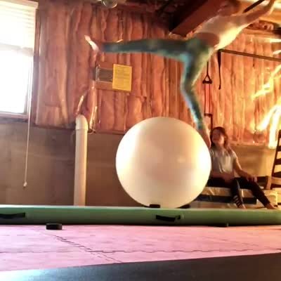 A young girl swings from a bar and tries to jump onto a large yoga ball but bounces off of it and falls to the floor.