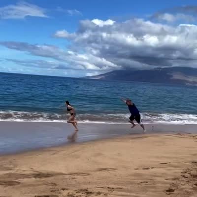 A man attempts to race a young girl on a beach but stumbles and tumbles then tries to get back up but a wave keeps him down.