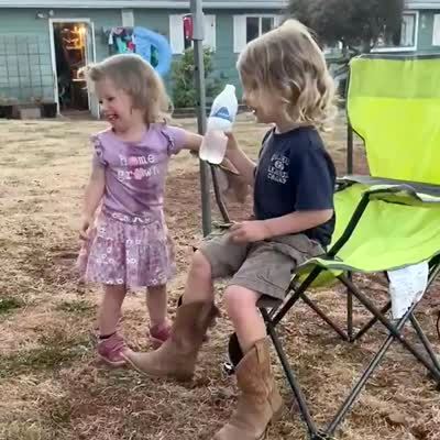A young girl attempts to drink water from a plastic bottle before she gets ran over by her pet dog.