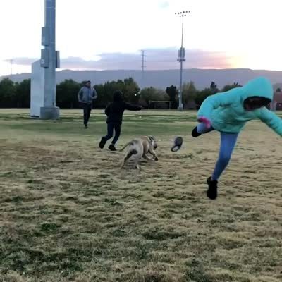 A young girl throws a tennis ball in a park and a dog chases after the ball and it pulls the girl down with her leash. The dog then crashes into another young girl and knocks her down as well. Slow motion.