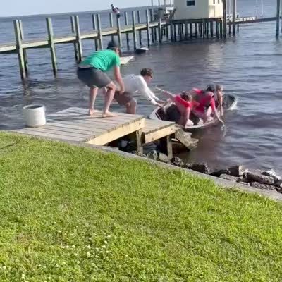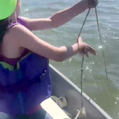 A young girl sits on the back of a boat and says, "I can do this!" while she motivates herself to pull a large crab into the boat. She cheers for herself and celebrates!