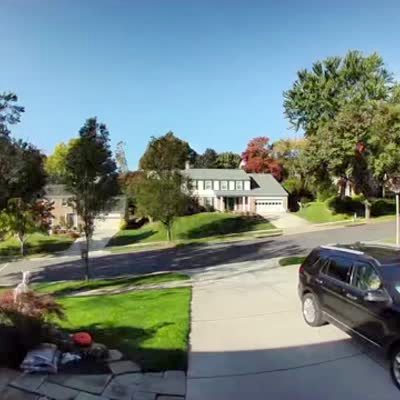 A woman runs down the driveway to try and catch her husband before he drives away when she stumbles and face-plants onto the driveway. The man gets out to help her but forgets to put the vehicle in park. Then the car starts to roll down the street with their kids inside of it, as he runs to jump in and stop it." Security footage.
