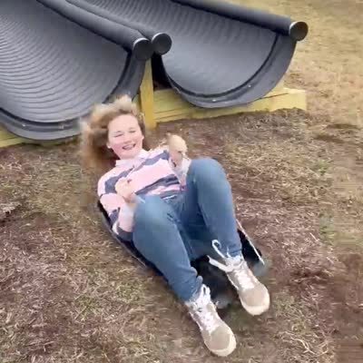 A young girl speeds down a slide on a sled, then crashes outside while her mother laughs.