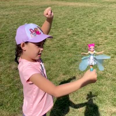 A young girl takes her toy fairy doll and flies it outside. It goes up in the sky very high and never comes down.