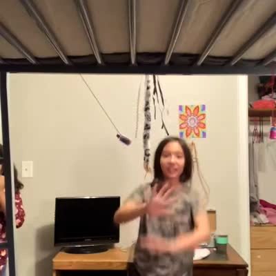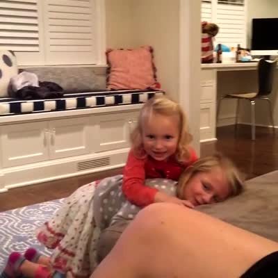 Two young girls dance to the song "The Chicken Wing Beat" at home, then one of them jumps up and hits her head on a metal bed frame. Music rights not cleared.