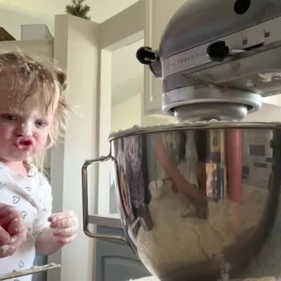 A young girl uses a Kitchen-Aid mixer with her mother. She turns it on too high and flour flies up out of the bowl and covers her face as well as the kitchen counter.