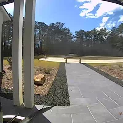 A young girl screams and runs away from a rooster in a yard. Security footage.