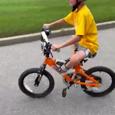 A young girl learning how to ride her bike with her dad crashes into her encouraging mom behind camera.