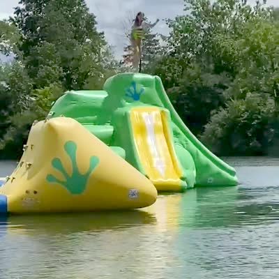 A young girl stands on top of a large inflatable slide in the middle of a lake. The young girl attempts to jump and slide down, but she bounces off the slide and falls hard into the water.