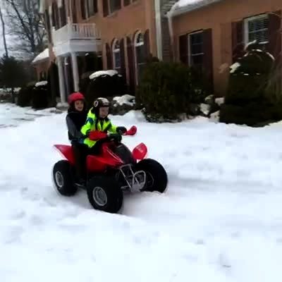 A young girl drives an ATV around in the snow with her father sitting in the passenger seat. They run over a wall of snow and very nearly hit the front of their house.