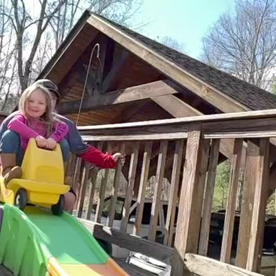 A man pushes a young girl on a toy roller coaster on the back deck, but the car flies off of the track, and she falls off. Slow motion.
