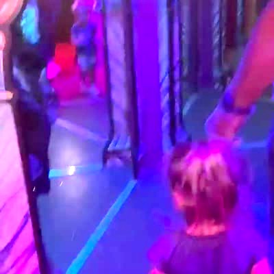 A man and two young girls go through a hall of mirrors maze. The younger girl runs fast into a mirror and falls.