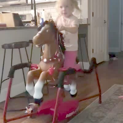 A young girl rides a rocking horse and repeatedly says "I gotta slow down, Poppy slow down," but she does not slow down and eventually she just falls off.
