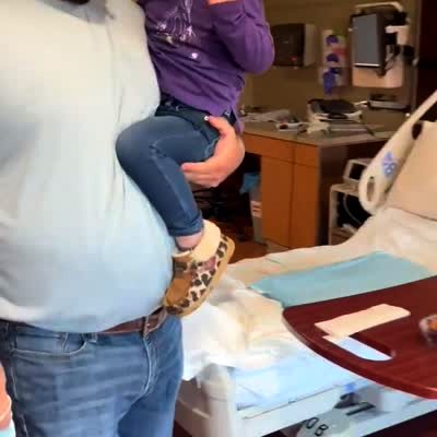 A man that carries a young girl on his shoulder and she hits head on porch light above. Security footage.