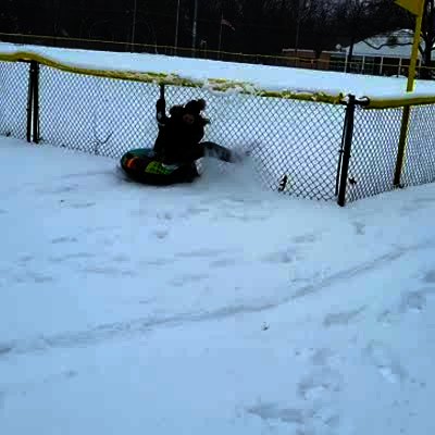 A young girl rides a snow-tube down a hill and screams and slams into a fence at the bottom.