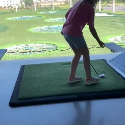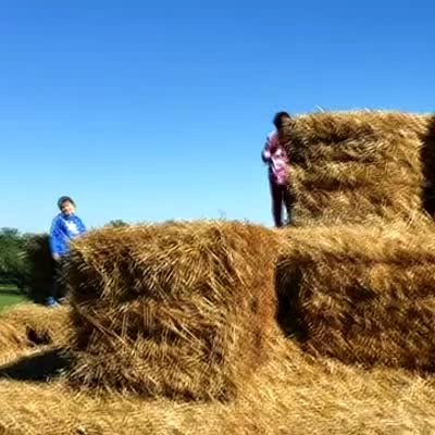 A young girl repeatedly stops and starts as she tries to jump from one hay bale to another. When the girl jumps, she falls short and hits the ground.