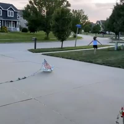 A young girl in her front yard tries to fly a kite but instead, it drags behind her, scraping against the ground.