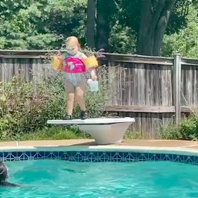 A young girl stands on a diving board. She attempts to jump in a swimming pool. But when she jumps she falls on the diving board before she falls into the water.
