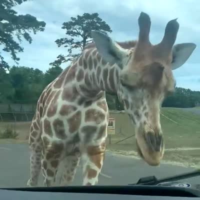 A giraffe chews on a family's car antenna as they go through a drive-through safari. It then picks up the windshield wiper and breaks it.