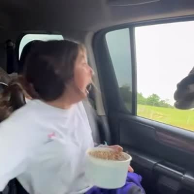 A teen girl yells in surprise while inside a parked car as a llama comes though the window of a drive-thru safari, startling her.