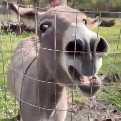 A woman sings "Jingle Bells" to a donkey on a farm. The donkey brays and repeatedly makes noises while she sings.