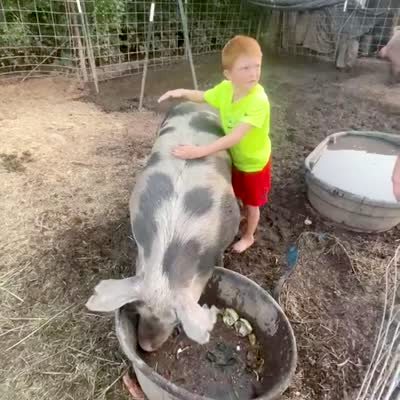 A tot boy gets on a large pig and rides him. The pig runs around and tosses the boy off his back and he lands in a tub of water.