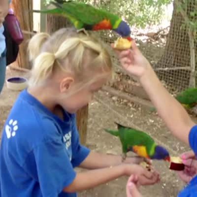 A parrot bird outdoors at the zoo flies onto a young girl's head and eats fruit a friend.